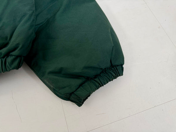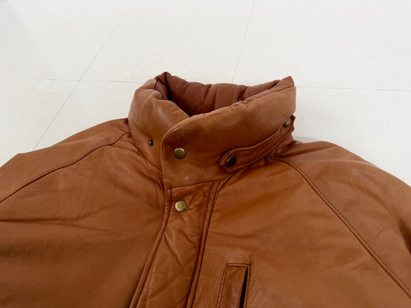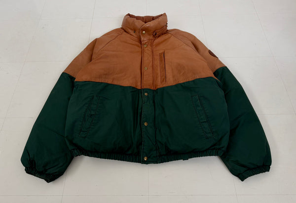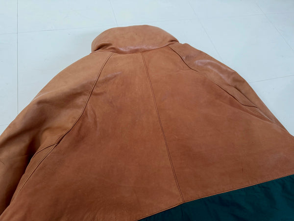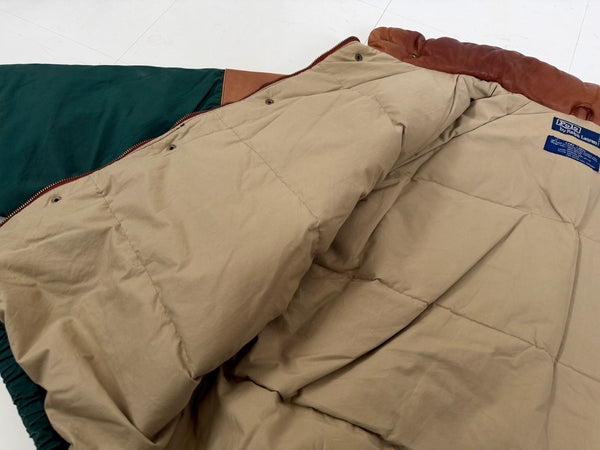 品のあるブラウンレザー&フォレストグリーンの切り返しがデザイン性の高いダウンジャケット。