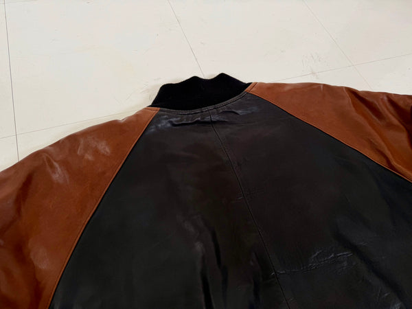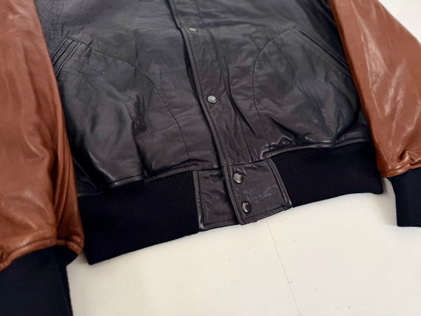 2色のスムースレザーを用いた切り返しがインパクトのあるヴァーシティジャケット。